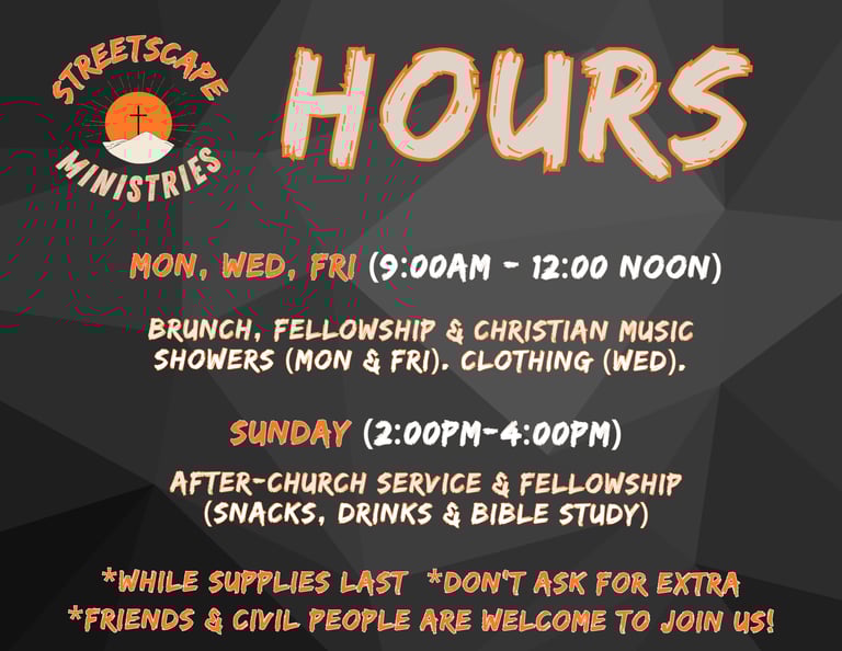 Our mission is to meet immediate needs—feeding the hungry, clothing the poor, offering showers, laundry, and shelter—while also providing fellowship, mentorship, and restoration. StreetScape is a refuge off the street- a place of compassion, where the weary are refueled, the broken are restored, and disciples are sent back to the streets to be the love they received.